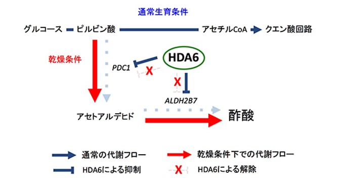 植物において、通常生育時に解糖系からクエン酸回路への代謝フローが機能している。このとき、HDA6タンパク質は酢酸合成に働く酵素遺伝子PDC1とALDH2B7を直接抑制している。乾燥条件下では、解糖系からクエン酸回路へのフローが抑制されるとともに、これら遺伝子領域からHDA6タンパク質が乖離し、酢酸合成系の抑制が解除されることで、乾燥に応答した酢酸の合成が誘導促進される。
